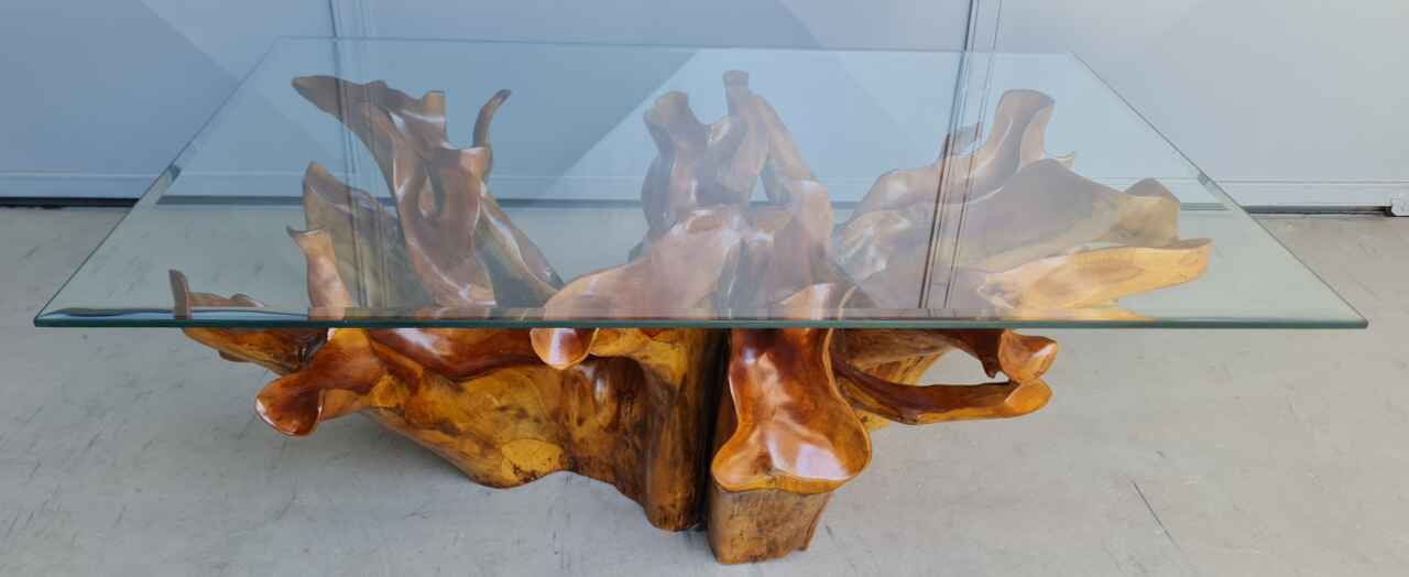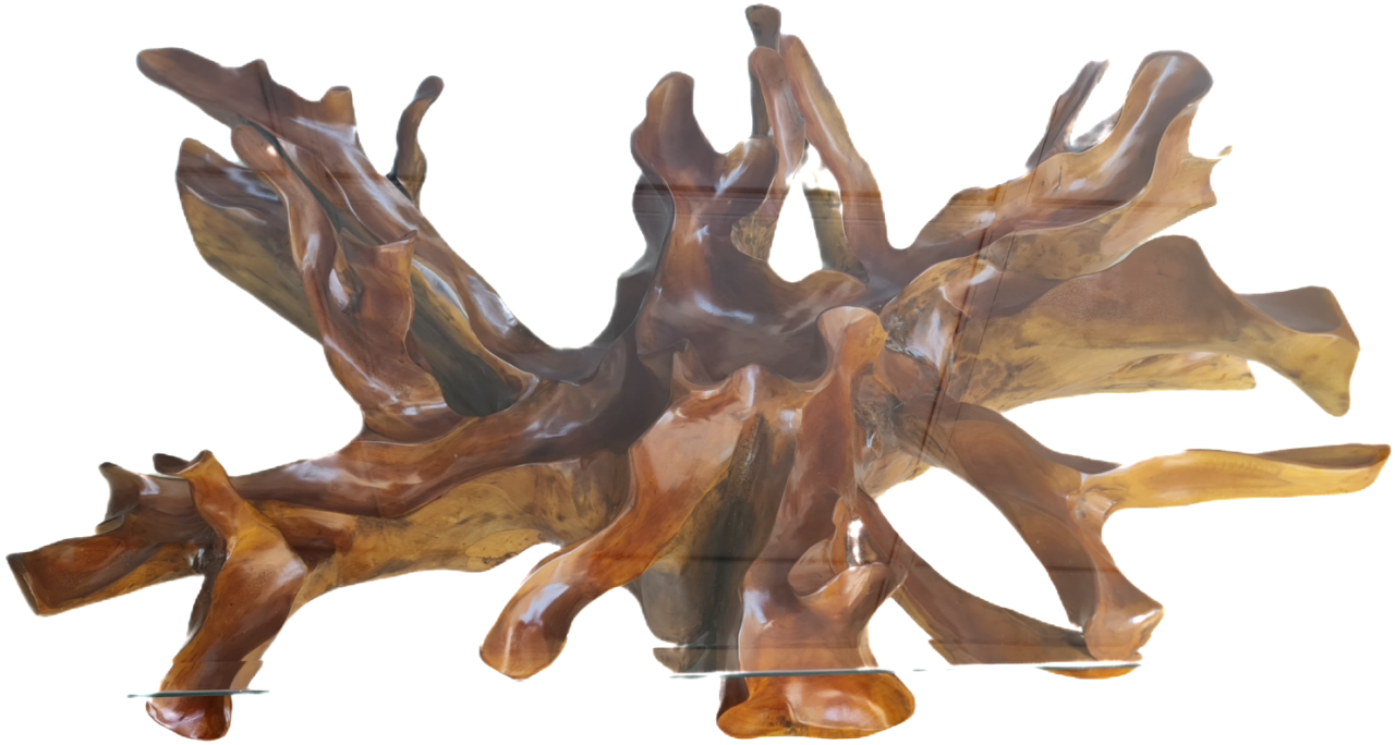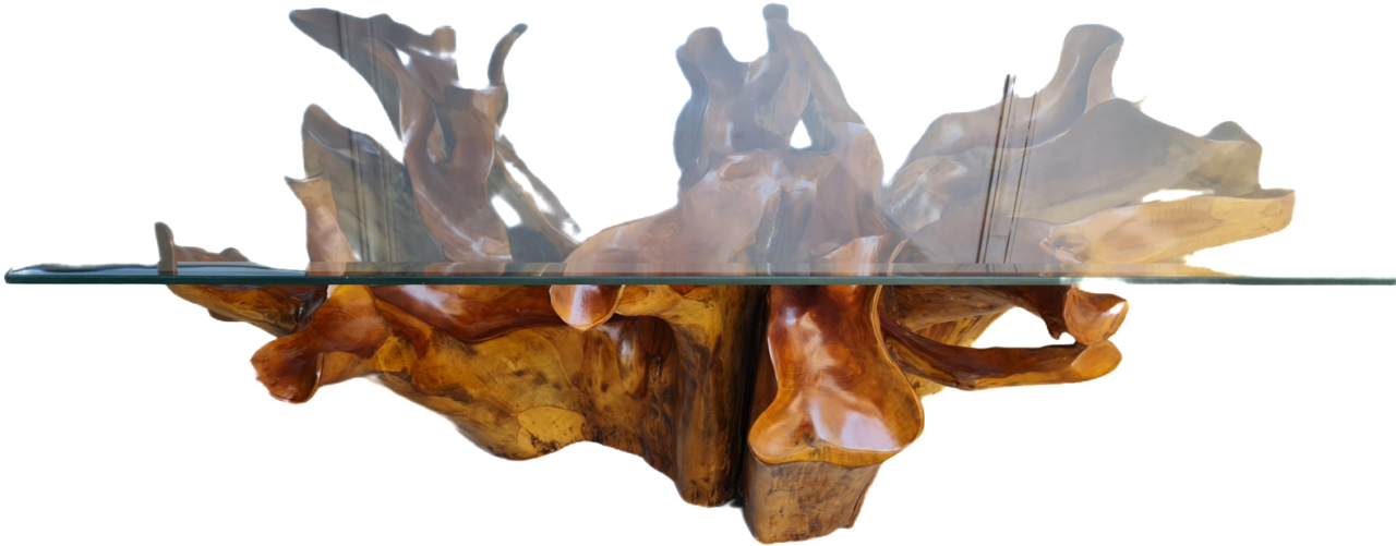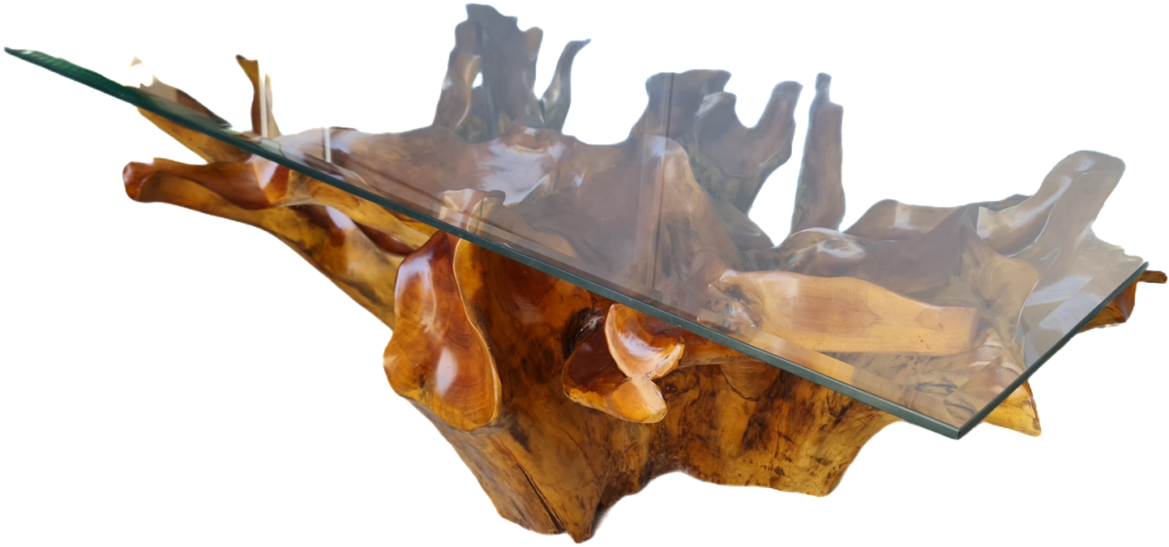 Изключителна красива холна маса от Naturally тиково дърво – корен под формата на цвете, финно обработено с закалено стъкло внос от Индонезия.